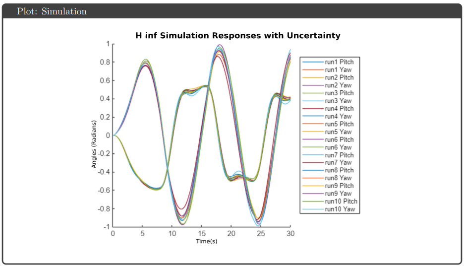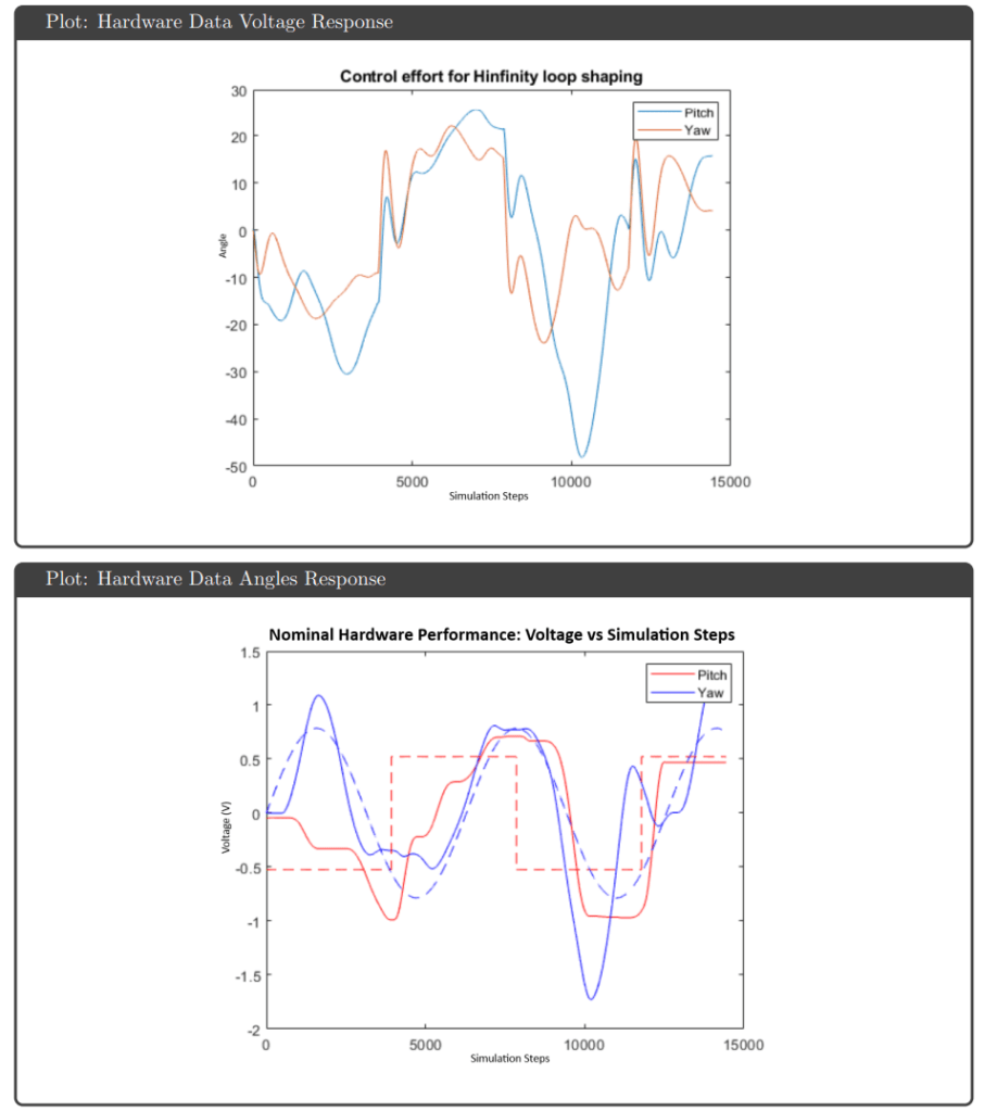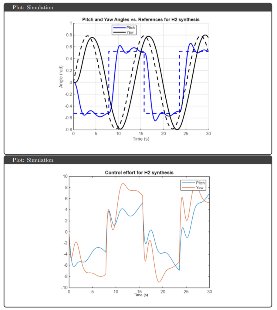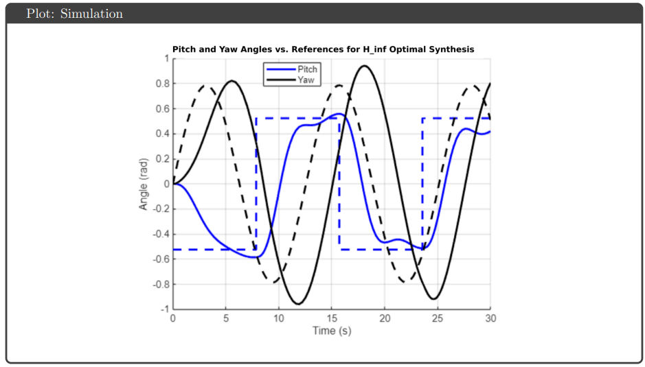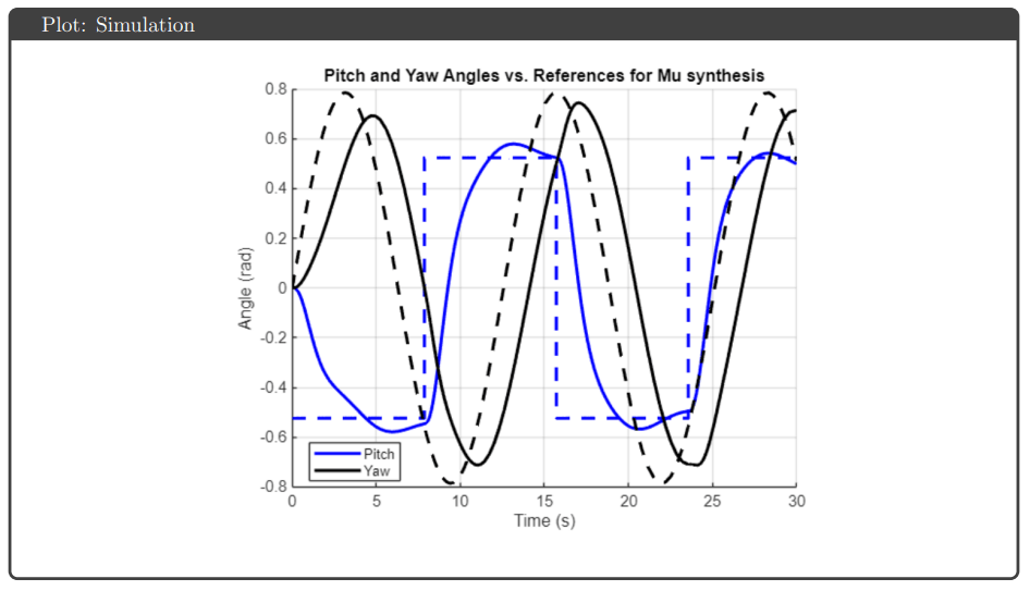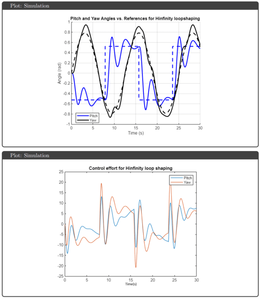 Simulation Results: All four controllers tracked pitch and yaw references well in simulation, avoiding actuator saturation under both nominal and uncertain plant conditions. The key differentiator was robustness guarantees: H∞ optimal and μ-synthesis achieved robust stability and performance metrics below 1, while H∞ loop shaping and H₂ optimal tracked effectively but failed to meet robustness thresholds.