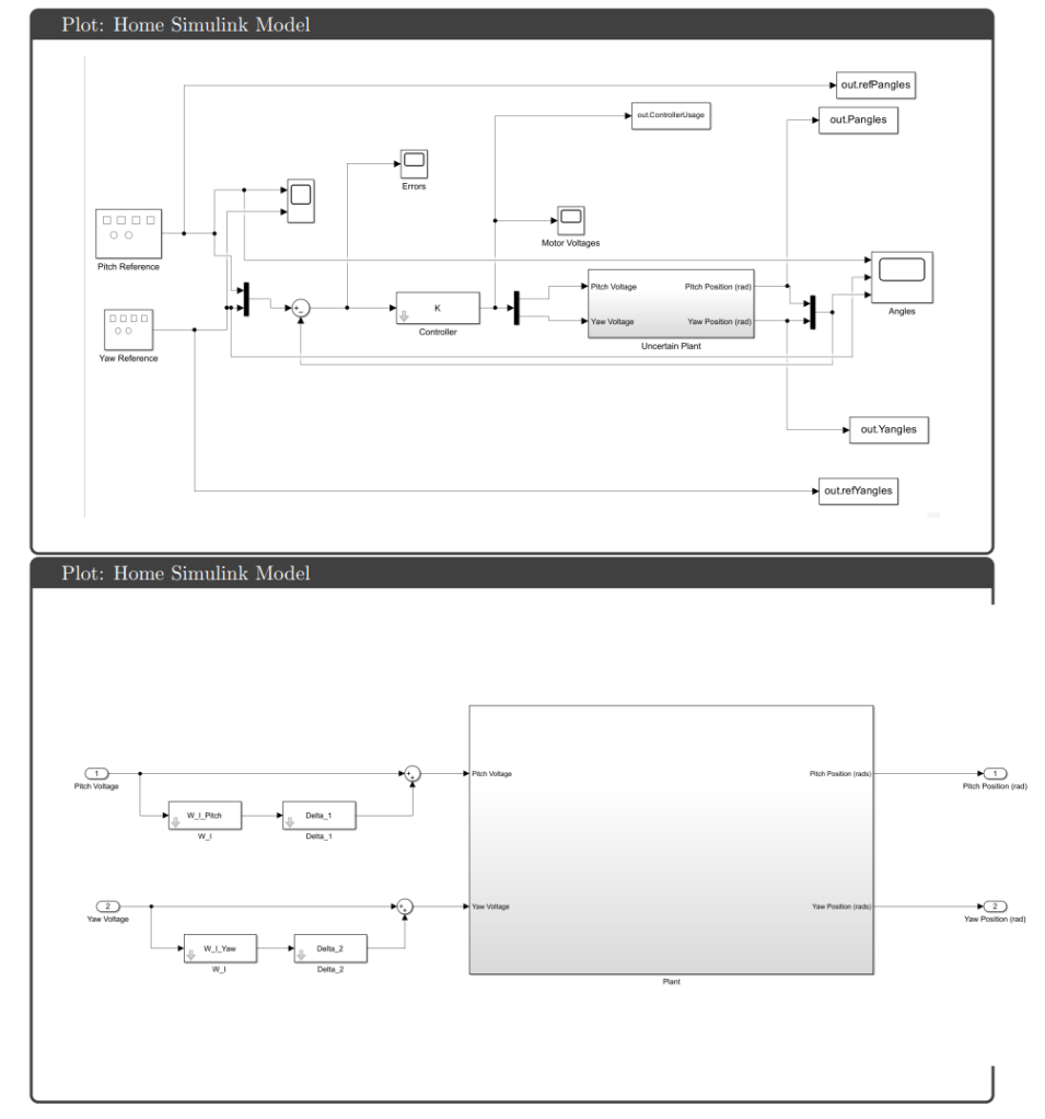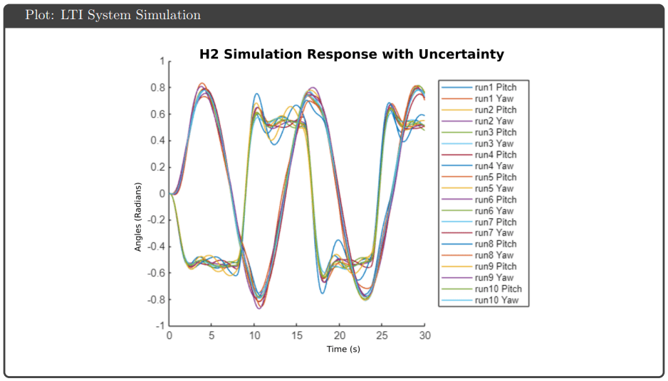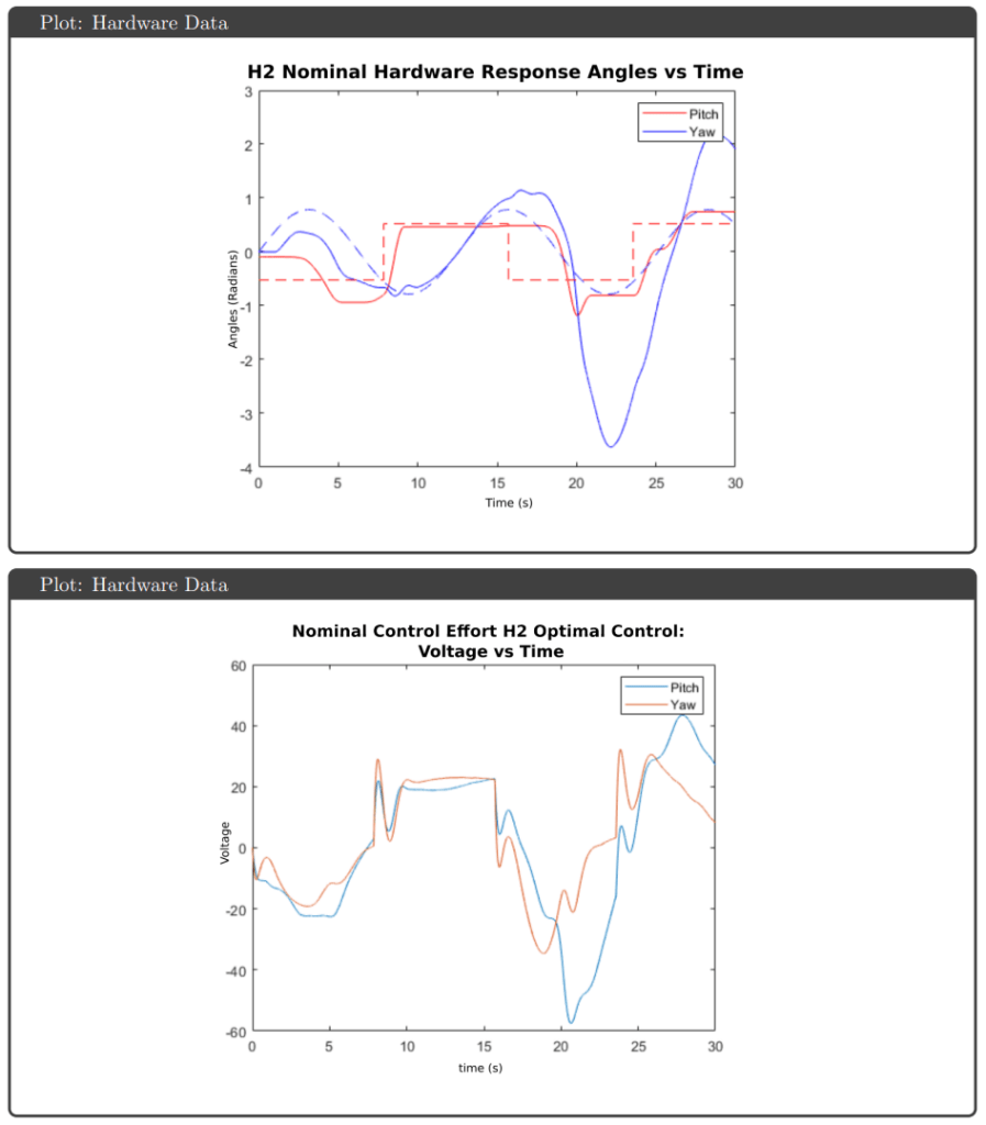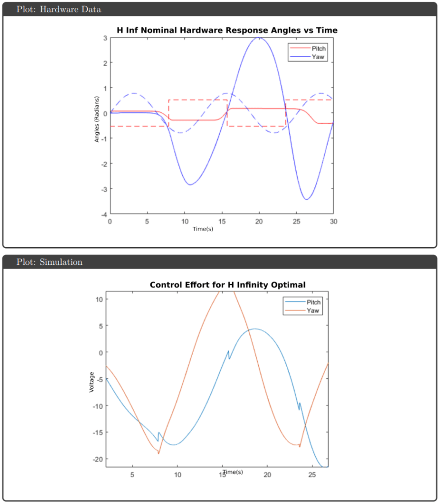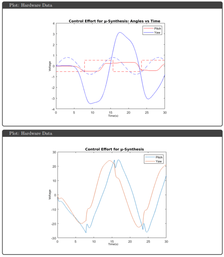 Simulation Results: All four controllers tracked pitch and yaw references well in simulation, avoiding actuator saturation under both nominal and uncertain plant conditions. The key differentiator was robustness guarantees: H∞ optimal and μ-synthesis achieved robust stability and performance metrics below 1, while H∞ loop shaping and H₂ optimal tracked effectively but failed to meet robustness thresholds.