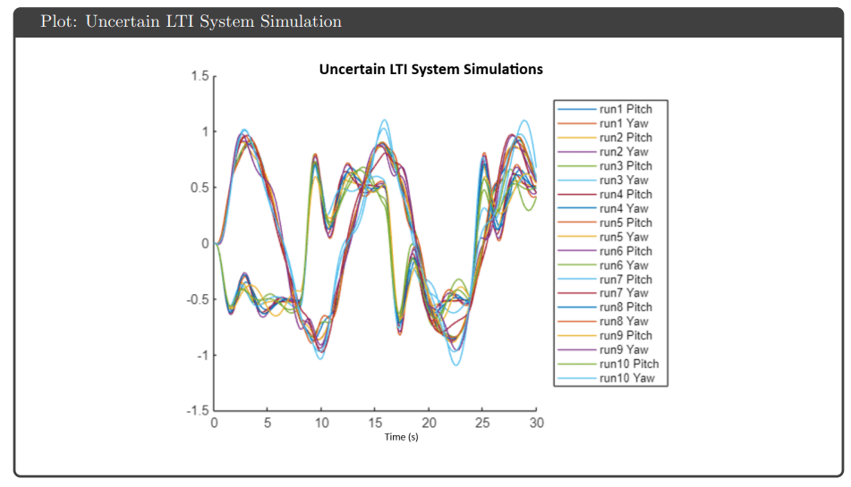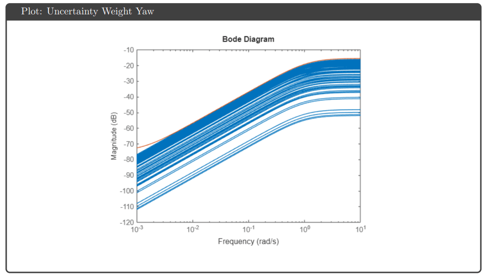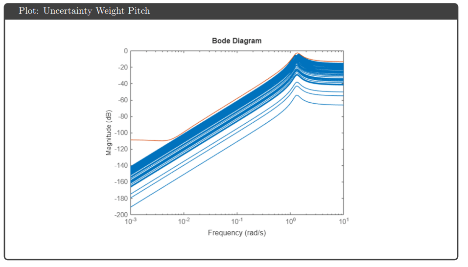 Uncertainty Modeling: Input multiplicative uncertainty weights were generated using the ucover command to bound plant variations across 100 sampled realizations. Separate weights for pitch and yaw channels captured frequency-dependent uncertainty, with higher uncertainty at high frequencies reflecting unmodeled dynamics.