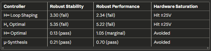 Key Observations: The controllers that achieved theoretical robustness guarantees (H∞ optimal and μ-synthesis) also avoided saturation on hardware, suggesting the robustness framework successfully accounted for gain variations that would otherwise drive actuators to limits. μ-synthesis provided the best robust performance metric (0.70) but required higher controller order, complicating tuning. The consistent sim-to-hardware gap across all controllers highlighted that actuator deadzones and other nonlinearities require explicit modeling beyond linear uncertainty bounds.