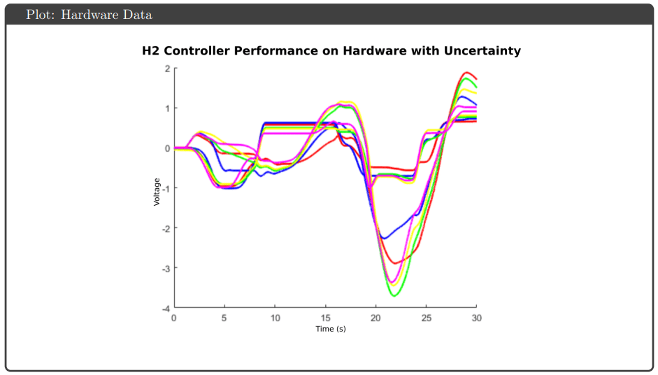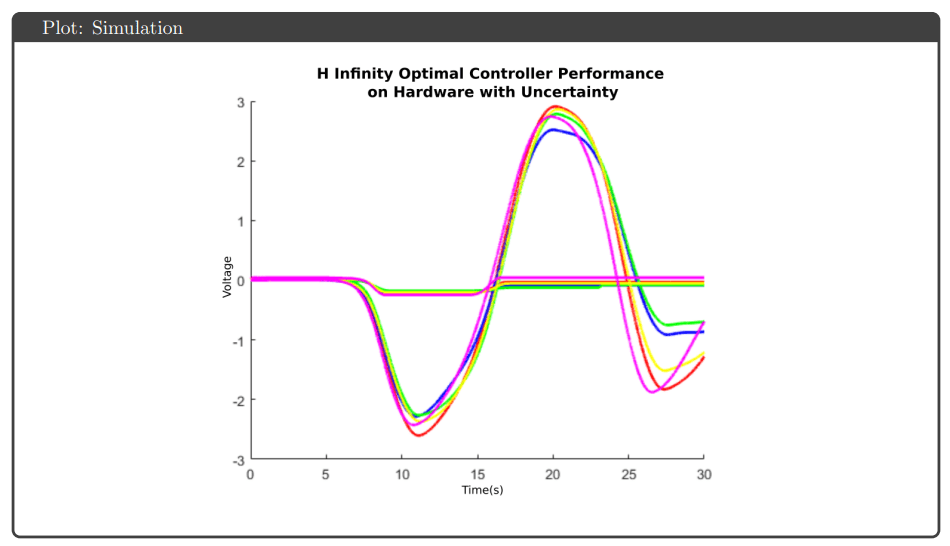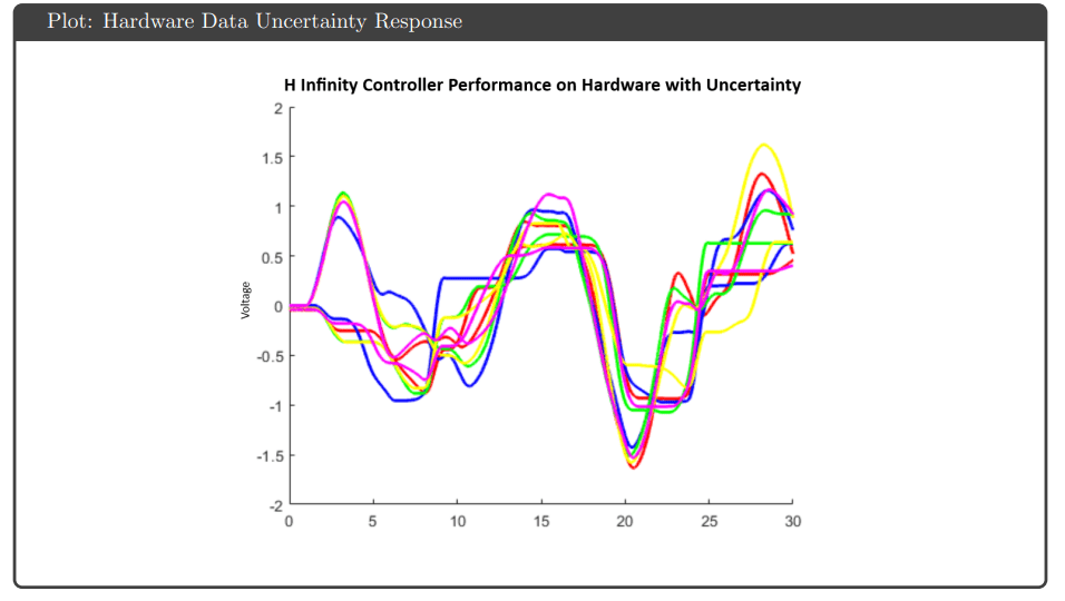 The results demonstrated that achieving robustness guarantees in simulation does not ensure equivalent hardware performance when significant nonlinearities exist. The project reinforced that controller complexity (order, bandwidth) must be balanced against practical implementation constraints. These robust control principles—modeling uncertainty explicitly, synthesizing controllers with guaranteed margins, validating on hardware—apply broadly to any system where parameter variations or unmodeled dynamics threaten stability and performance.