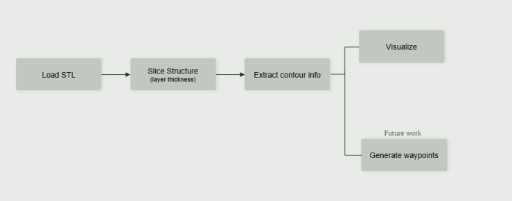 The objective of this project was to create a visualization system that automates the critical preprocessing steps necessary to eventually develop waypoints for concrete 3D printing. Specifically, the system integrates four components: STL loading, uniform slicing, contour extraction, and real-time 3D visualization. By visually confirming each upstream step, we ensure the contour information used for waypoint generation is accurate and reliable.
